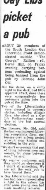 A reporter for the Times Diary visited the South London Gay Community Centre and interviewed the SLGLF Candidate during the 1974 General Election Campaign in what he described as a "shabby set of rooms in Brixton's black area".